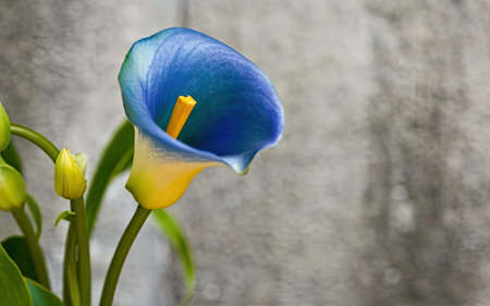 Blue calla lily on a wooden background. Copy space.
