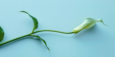 Elegant white calla lily on blue surface with green leaf, botanical beauty and serenity concept