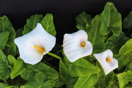 White calla lily plant with flowers on black background, dark key concept
