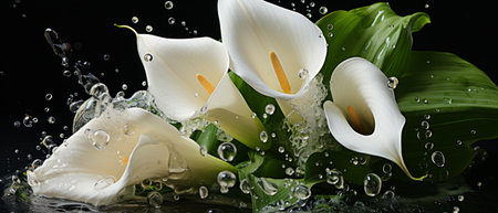 Beautiful calla lily flower with water drops on black background
