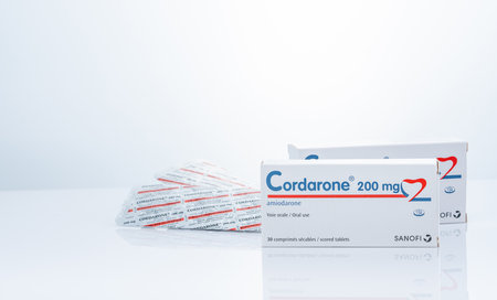 CHONBURI, THAILAND-SEPTEMBER 23, 2022 : Cordarone in blister pack and paper box packaging. Sanofi product. Amiodarone white tablet pills for treatment arrhythmias. Prescription drugs. Pharmaceutics.