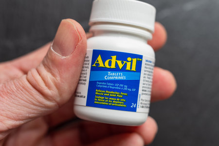 Montreal, CA 26 March 2020: Hand holding a bottle of Advil Ibuprofen pills.