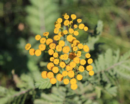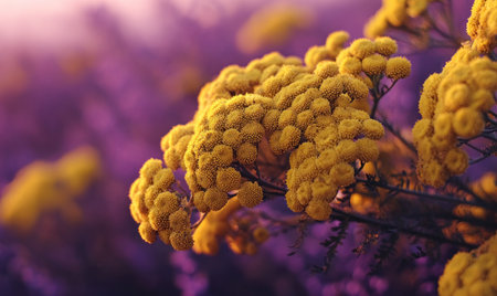Golden yellow, tightly clustered flower heads bloom against a soft, purple, blurred background