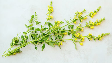 Green stems with clusters of vibrant yellow flowers lie against a pale surface showcasing the beauty of nature in simple elegance.