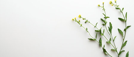 Delicate yellow wildflowers with green stems are artistically placed on a clean light colored background emphasizing their natural beauty.