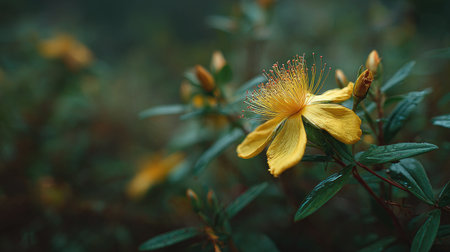 A detailed photograph of a single St John s wort, swaying gently in the wind, captured in natural daylight. Fresh and airy atmosphere, soft motion blur on leaves, crisp details on textures, background softly blurred into natural greenery, cinematic natural light, realistic photography style.