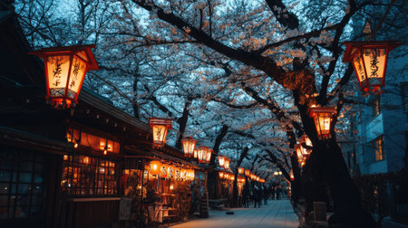 A tranquil cherry blossom pathway lined with glowing lanterns creates a serene atmosphere during twilight in a charming Japanese town setting.
