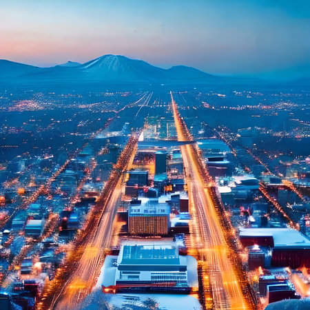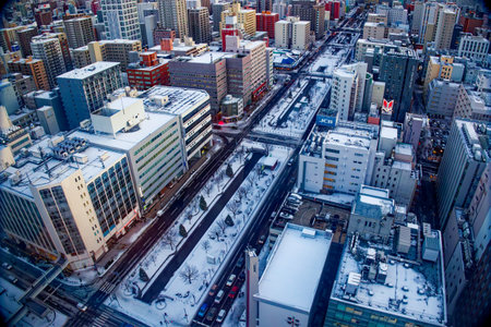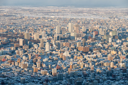 Hokkaido, Japan - December 20, 2022 : Aerial view of cityscape of winter Sapporo, Hokkaido, Japan