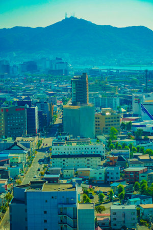Hakodate city skyline in springtime sunny day morning. Hokkaido, Japan