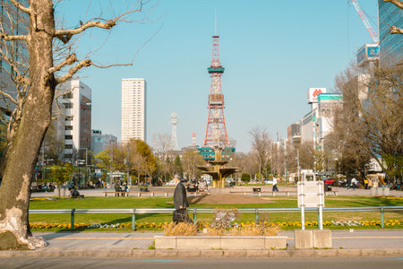 Sapporo, Hokkaido, Japan - April 25, 2023 : Odori Park and Sapporo TV Tower at spring