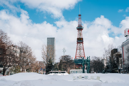 Sapporo, Hokkaido, Japan - February 16, 2024: Winter Snow Scene of Odori Park and Sapporo TV Tower