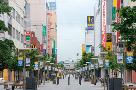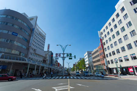 Sapporo cityscape with buildings, road, cars and walking people in Hokkaido, Japan.