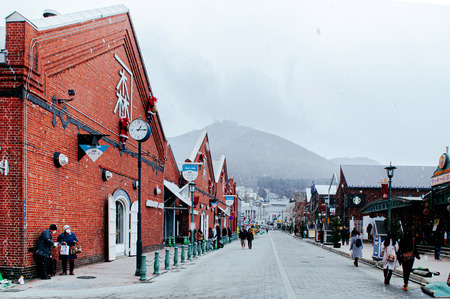 Hakodate, Hokkaido - December 2019 : Landmark of Hakodate, Japan cityscape at the historic Red Brick Warehouses. During Winter in the morning with snow on ground
