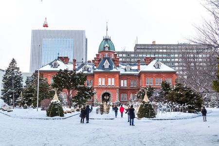 Sapporo, Japan, January 28, 2018: The red brick former Hokkaido Government office is popular tourist destination. Featured here day scene of the attraction during winter with snow.