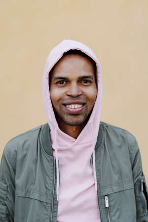 Afro man portrait wearing pink parka with hood on his head posing on pale yellow background