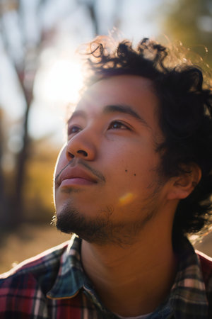 A mature indonesian man in dark shirt looks pensively upward outdoors amid green trees with a concentrated yet serene expression