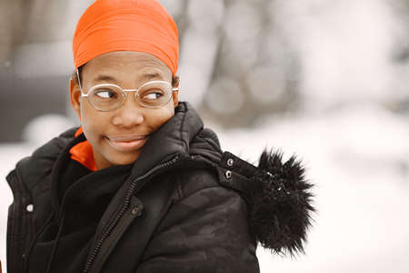 Close up Handsome African-American guy with glasses on the street. Portrait black man serious