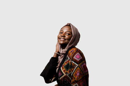 Dreamy black girl wear hijab smile and rejoice on white background. Muslim happy woman posing in studio. Attractive african female.