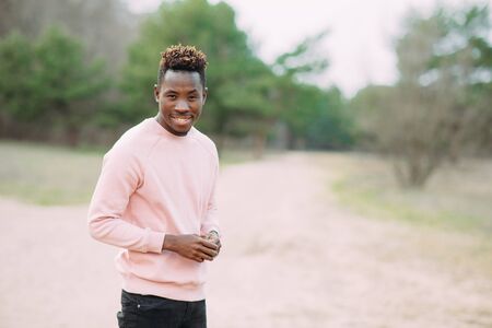 Portrait of stylish curly handsome black man standing outdoors, fashionable african american man posing and looking to the side against rocks background