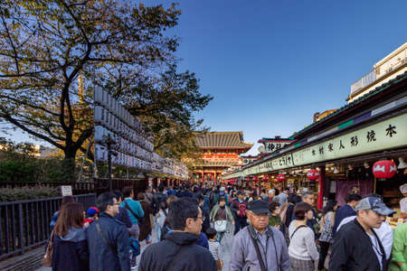 ASAKUSA, JAPAN - Oct 29, 2016: Nakamise Shopping Street Asakusa on Oct 29 in Tokyo, Japan. It is lined by more than 50 shops, which offers local specialties and tourist souvenirs.