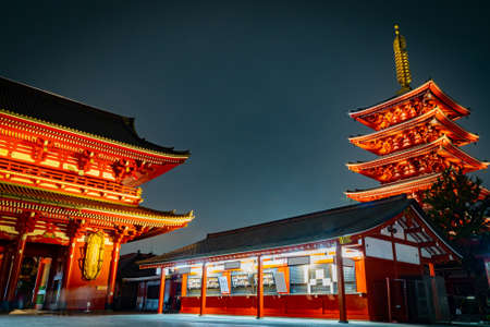 Night light of Sensoji-ji Temple - Asakusa district, Tokyo City - Japan, historic architecture.