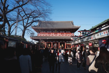 ASAKUSA,TOKYO,JAPAN JANUARY 15, 2020 : Asakusa Dera Sensoji is the oldest Buddhist temple in Tokyo. Originally founded in 645, it forms the center of the Asakusa district.