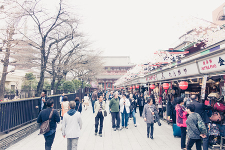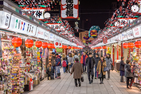 TOKYO, JAPAN - DECEMBER 23, 2015: Visitors to Senosoji Temple walk through Nakamise Shopping Street. The shop lined pedestrian street stretches from the fisrt main gate to the main temple grounds.