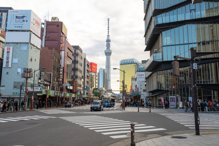 Tokyo, Japan, January 2024. view of the Tokyo skytree tower on the background of a downtown street
