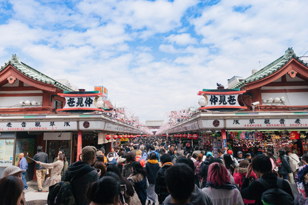TOKYO,JAPAN - MARCH 27,2016 : Nakamise shopping street way to Asakusa Sensoji-ji Temple on 27 March 2016. Sensoji-ji Temple in Asakusa is the most famous temple in tokyo.