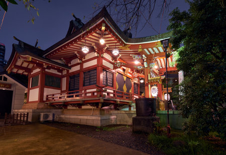 Tokyo, Japan - October 25, 2019: The night view of Aoyama Kumano Shrine, a small local Sinto shrine. Tokyo. Japan