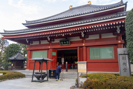 Tokyo, Japan- 16 Dec 2025: Yogodo Hall in Sensoji Temple in Tokyo, Japan. It is built for worshippers to pay homage to Kannon and the eight guardian Buddhas.