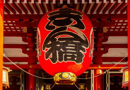 Asakusa, Tokyo, Japan - February 2020 : Red Lantern of Sensoji Temple’s Kaminarimon gate at main entrance is famous detination for toursit visit. Facade of Senso-Ji buddhist temple in Asakusa illumin