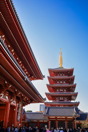 Iconic Japanese temple scene featuring a towering red pagoda beside ornate wooden roofs under a bright blue sky. Rich in culture and history, this image suits travel, architecture, and spiritual themes.