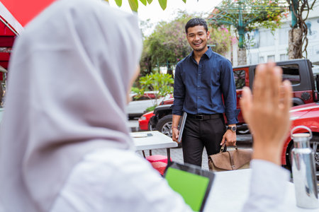Asian businessman comes on foot as veiled woman sits waving at coffee shop