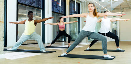 Group of male and female yoga beginners exercising against grey wall, doing yoga or pilates posture. Standing in Warrior pose, Virabhadrasana. Full length
