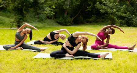 Wellbeing concept. Pretty young women doing yoga exercises at park, panorama