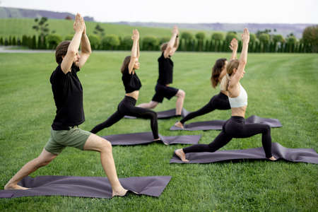 Group of european people practicing yoga on fitness mats on green meadow. Concept of healthy lifestyle. Idea of relaxation. Side view of athletic men and women barefoot and wearing sportswear