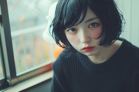 Portrait Of Stylish Young Japanese Woman With Short Hair, Looking Thoughtful By Window