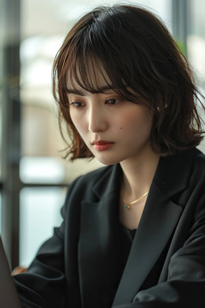 Focused Japanese business woman typing at laptop in office closeup. Girl surfing internet