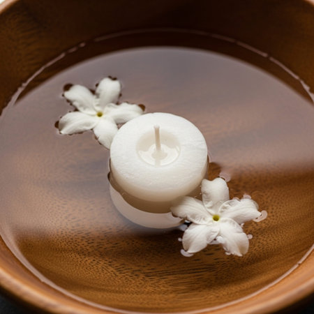 A focused 1:1 square close-up capturing an unlit white floating candle and surrounding jasmine bloss