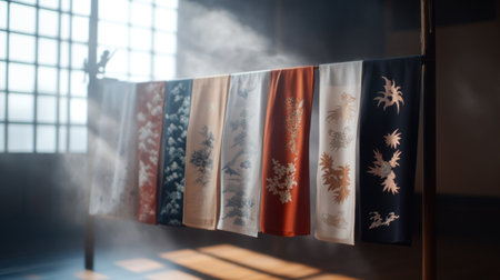 A close-up view of several beautifully embroidered Japanese textiles, showcasing a variety of colors and traditional patterns, hanging neatly.