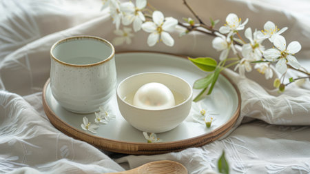 pearl in a delicate bowl, accompanied by white blossoms on soft satin AI generated