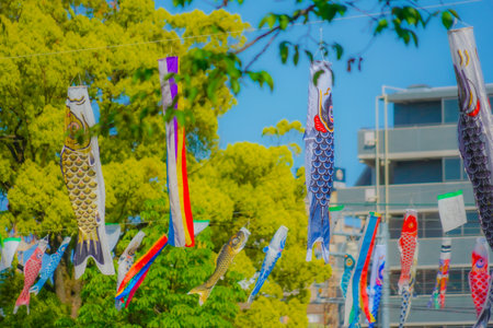 Carp streamers swimming in a line. Shooting Location: Kanagawa Ward, Yokohama City