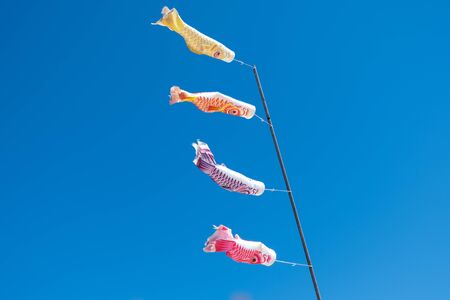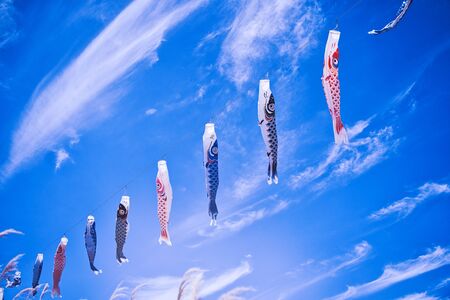 Koinobori - traditional festival decoration for Children's Day during the Golden Week in Japan. Carp-shaped windsocks flying in the blue sky on a sunny day.