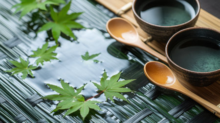Elegant chanzy setup with fresh green maple leaves floating on the water surface beside bamboo ladles