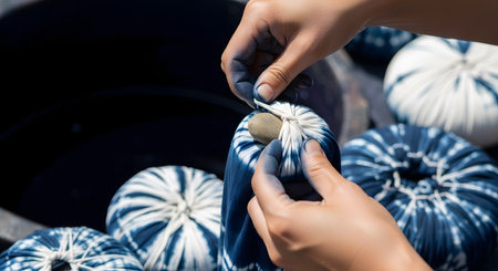 A close-up of hands with blue-stained fingers tying a small stone into a piece of white fabric. This is part of the shibori or tie-dye process, with other tied fabric bundles and a dark vat of indigo dye visible in the background.