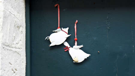 Martisor, red and white, yarn floss thread, holiday of welcoming spring in Moldova and Romania, celebrating on March , tradition give boutonnieres in the form of flowers Baba Marta