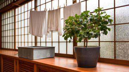 A serene indoor laundry space featuring hanging clothes, a potted plant, and warm wood accents. The natural light adds a cozy feel to this modern design.