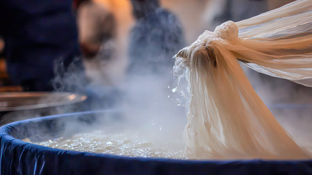 A close-up view of steam rising from a large container of water, where a piece of fabric hangs gracefully over the edge, reflecting the artistry involved in traditional textile-making.
