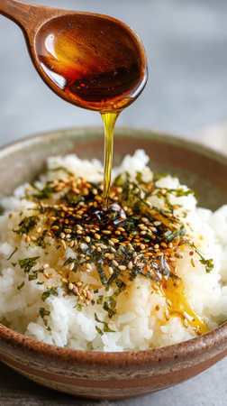 Japanese rice with soy sauce and sesame seeds in a bowl.